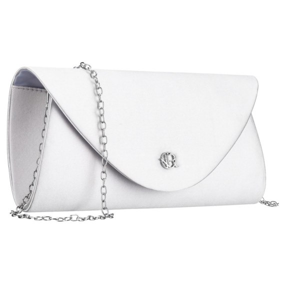 Elegancka kopertówka damska z tkaniny syntetycznej. Torebka w srebrnym kolorze. Zawieszona na srebrnym łańcuszku, który dodaje biżuteryjnego charakteru. Jednokomorowa, zapinana klipsem magnetycznym.