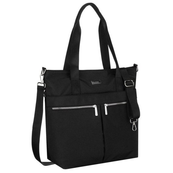 Praktyczna, czarna torba damska wykonana z poliestru. Wyposażona w wygodne uchwyty i doczepiany, regulowany pasek. Jednokomorowa z aż siedmioma dodatkowymi kieszonkami. Zamykana suwakiem.